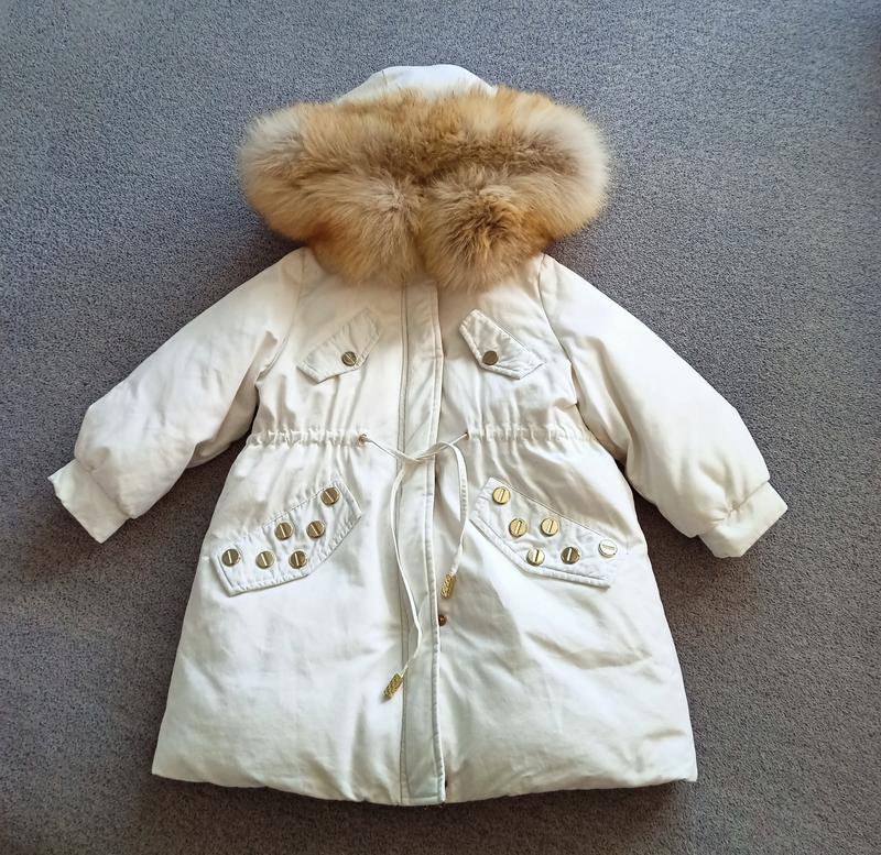 Стан идеален, очень тёплая, отделка дорогостоящая фурнитура на натуральный мех, есть карманы,жно затянуть по талии, капюшон не снимается, мех по желанию можно отстегнуть, утеплитель синтепон высокого гатунка, на возраст 4 -4,5 рочки