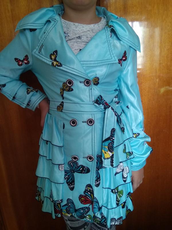 Суперське пальтішко небесно блакитного кольору в яскраві метелики,на підкладці.Стан ідеальний.Спереді є практично незамітна затягування,альо навіть на фото не видно.Стан нової речі вдягали декілька разів.Підійде на розмір від 38-42.На ріст від 152-до164см.Заміри при потребі надам.Ошатнішою і не парити можна одівати навесні, восени та літом,коли прохолодно.Буду рада відповісти на ваші запитання приємного перегляду.Відправляю після повної оплати на картку Приватбанку зручною для вас поштою.