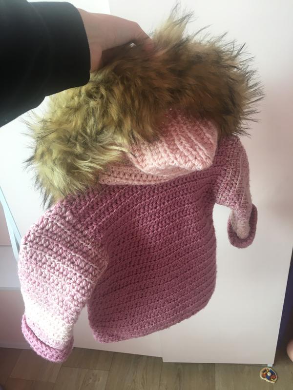 дуже крутий кардиган з опушкою. Без замірів, нам в'язали на замовлення на зростання 90-100 див. Брали дорожче, вручну підшили фліс.дуже гарна тепла річ. З недоліків, не вистачає однієї гудзики в самому верху.