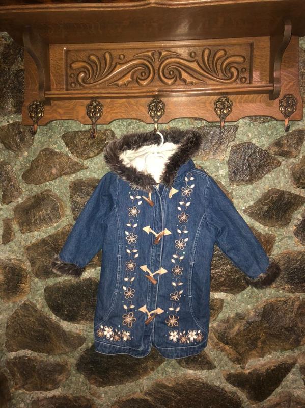 Тепленьке джинсове пальто з вишивкою, штучний хутро.
