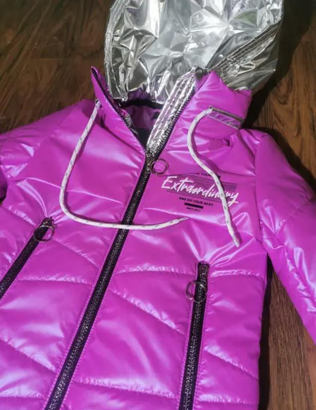 Стильна, демісезонна куртка парку для дівчаток. Сезон весна-осінь. Виготовлена із сучасної водовідштовхувальної плащової тканини, утеплена легким силіконізованим утеплювачем. Підкладка по спинці посилена флісом. Куртка має капюшон, виготовлений зі срібної плащової тканини (відстібається). На рукавах передбачений трикотажний манжет. Використана оригінальна фурнітура та декор. Довжина рукава вказана без урахування манжета.