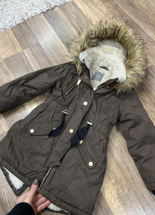 Дуже стильна і тепла на зиму парка для дівчинки 5 років довга під затяжечку регулюється стан ідеальний є нюанс з металічними елементами коло шнурка