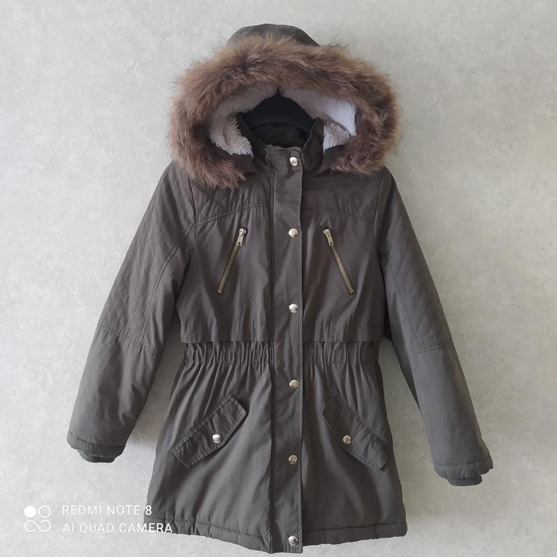 Парка для девочки на 10-11 лет (140-146) в красивом состоянии. Подкладка мех, в рукавах синтепон. Застегивается на молнию и кнопки. (Кнопки немного стертые). Длина 74-66 см, ширина 42 см, рукав 55 см от плеча.