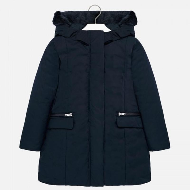 Парка на стьобаній підкладці. Сезон вічна-осінь. Верхня тканина має водовідштовхувальне просочення. Хутро на капюшоні знімне. Колір синій. Стан новий без бирки 🏷️Mayoral 8 лет/128 Довжина 65. ПОГ 41. Рукав 45