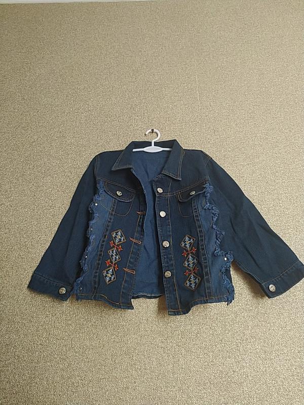Стильний піджак на дівчинку 4 роки з гарним орнаментом. Новий, не прорізані дірочки для гудзиків. Етекетка відірвалася, лишився тільки пластиковий тримач, показала на фото. Довжина- 39 см Довжина рукава від плеча- 35 см Ширина - 35 см