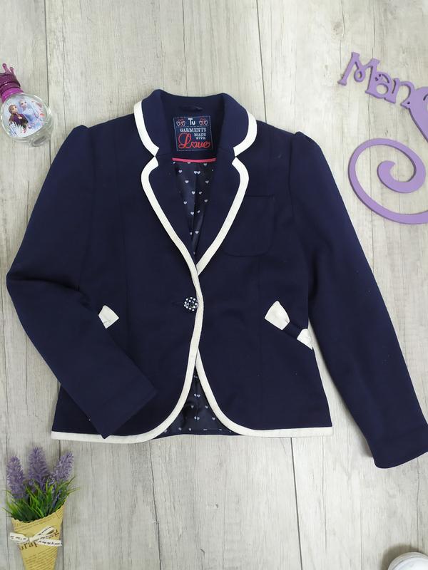 Піджак для дівчинки TU темно-синій із білими вставками стан: б/в, у дуже хорошому стані Виробник: Tu Розмір: йде на 92 (по бирці вказано 98-104) Колір: темно-синій Склад: 81% поліестер, 14% віскоза, 5% еластан