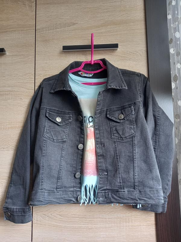Джинсовий піджак для дівчаток 7_8р, хоча на етикетці пише 9-10р. Сіро чорний довжина 40см. півобхват під руками 38см. рукав 41см плече8 см. футболка в подарунок півобхват під руками 38см. довжина 34см. Відправлю зручною для Вас поштою