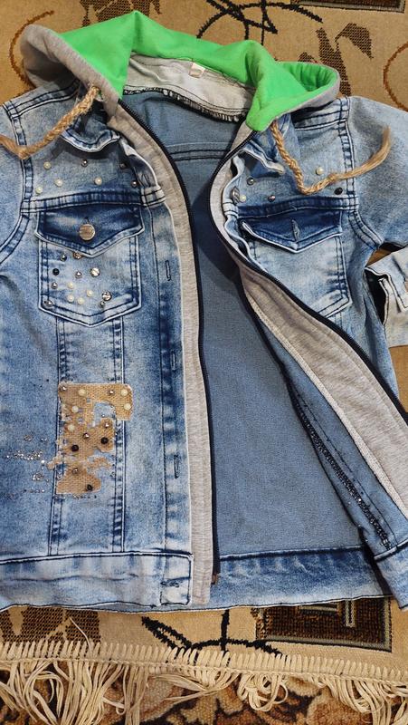 Продам джинсовку на дівчинку. Заміри на фото. Капішон трикотажний, не відстібається. Попереду блискавка та імітація застібки на гудзики.