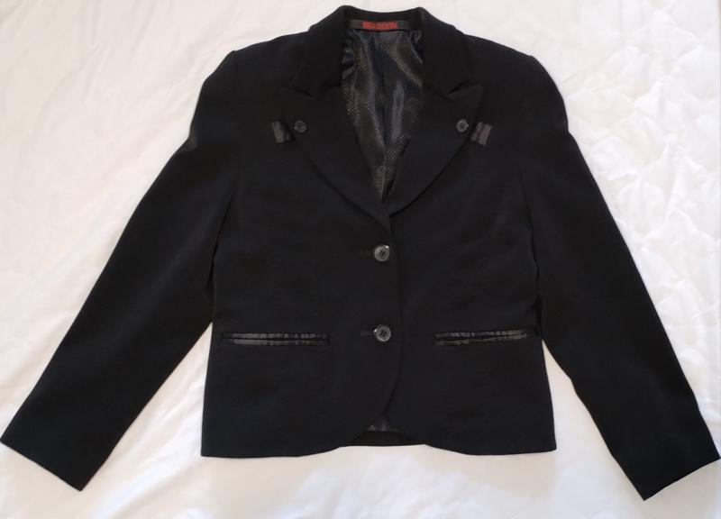 Чорний піджак, жакет на підкладці, в гарному стані на зріст 128 Довжина 43см Довжина рукава 47см ПОГ 38см Плечі 32см Склад Вовна 20% Віс 35% Пв 40% Лайкр 5% Українського виробника