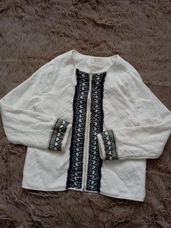 Текстурний піджак із вишивкою дівчинці підлітку 152р ,в дуже гарному стані,молочного кольору.Має невеличку жовту пляму на плечі ,але її майже не помітно , показала на останньому фото.