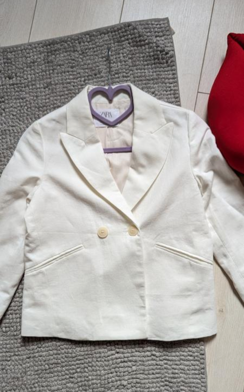 стильний піджак від zara , гарного актуального молочного кольору,в в складі бавовна та льон. Довжина по спині 49 см, рукав весь 50 см, від плеча 43 см, плечі 33 см, під руками-38-39см.