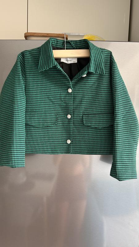 Неймовірний жакет на дівчинку . Колір зелений , пуговки з імітацією перлин . Дуже гарно сідає і під спідьницю і під джинси . Ідеальний для школи .