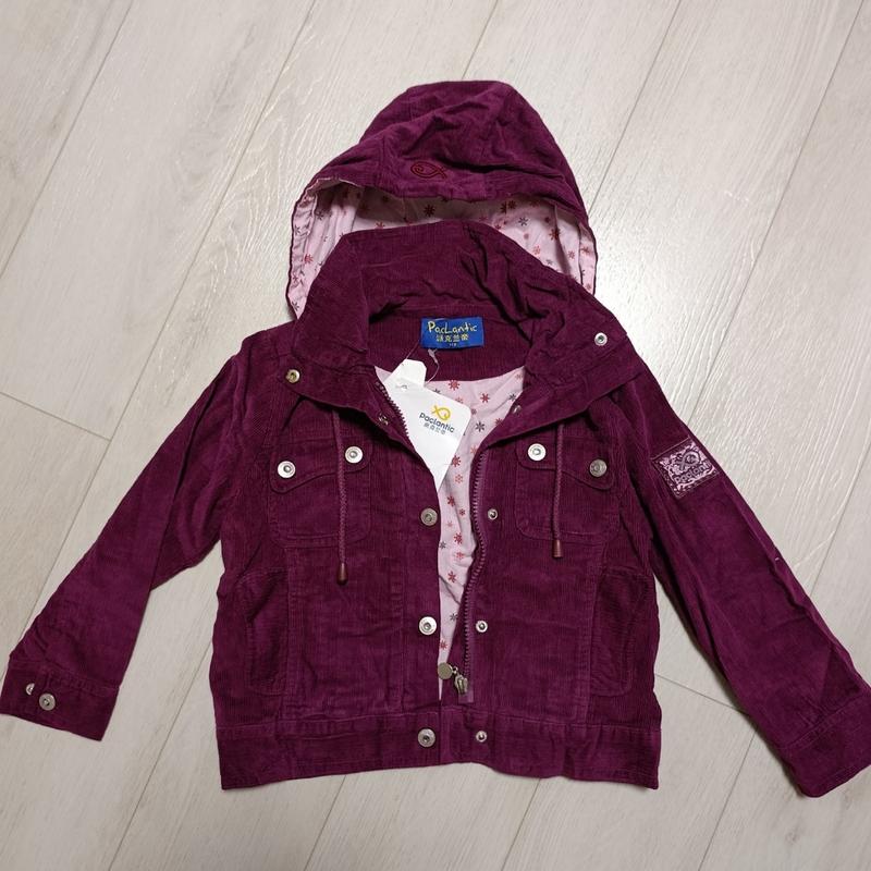 Нова джинсова кофта для дівчинки. Іде як вітровка. Під джинсом підкладка. Капюшон знімається. Ріст на етикетці 110см. Довжина по спинці 39см, рукав від капюшона 46см/ рукав від плеча 38см.