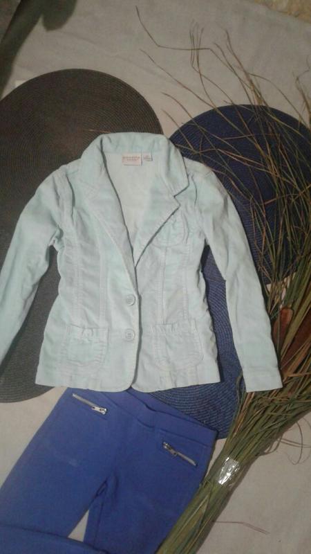 Модний піджак на дівчинку 8-9 років.Колір м'ята.Матеріал 98 %котон. Довжина 49,пог 37,рукав 45,плече 11.