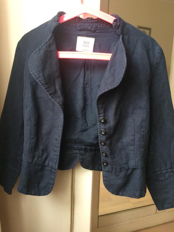 Темно-синій піджак NOA NOA з льону, дорогий бренд,ціна на офіційному сайті від 2500 грн; на підкладці,стан ідеальний. розмір маленький XS, підійде для школи плечі 41{у цій моделі вони трохи опущені} дуже красиві деталі і спинка ПОГ на рівні пахв 42 ПІТ 36-37 довжина 48 см рукава тут укорочені: довжина зверху 46, знизу 30