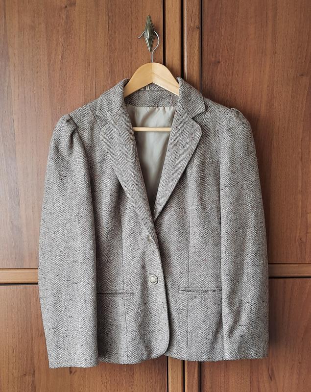 Вінтажний жіночий шерстяний піджак. Жіночий розмір M. Ширина в зоні плечей - 43 см, ширина в зоні грудей - 46 см, довжина ззаду - 63 см, довжина спереду - 64 см, довжина рукава - 60 см