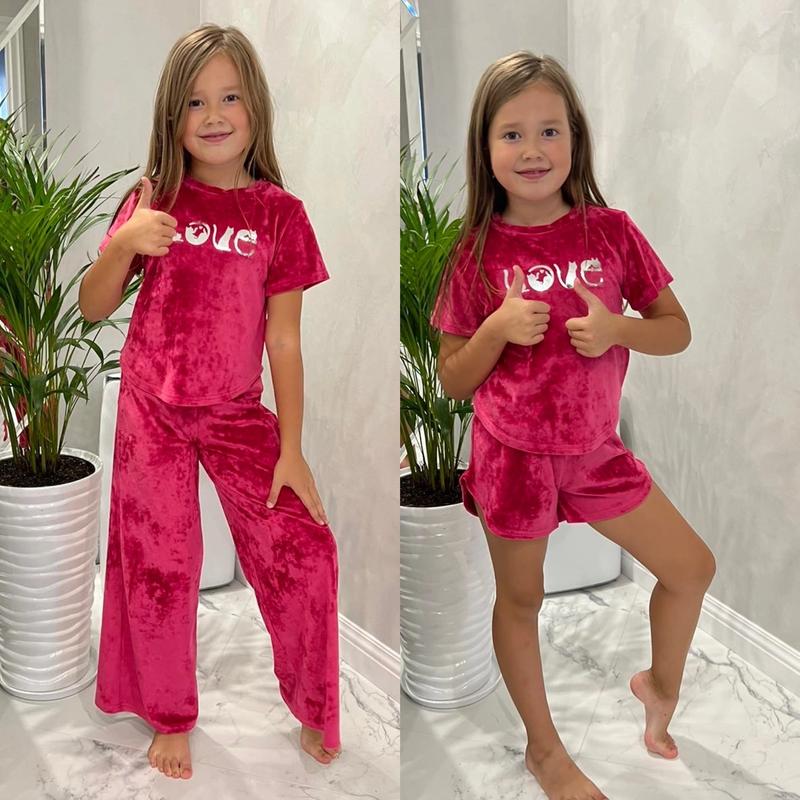 Нереально крута новинка піжамка трійка для дівчинки. В комплект входить: -футболка -топ -шортики -брючки Прикрашено написом, що переливається, прогумований накат. Тканина плюшевий, мармуровий велюр Піжамка дуже приємна до тіла, добре тягнеться. ціна 760грн заміри футболочка довжина\пог- шортики довжина\пояс -штанці довжина\пояс 134- 140- 146- 152- 158- 164-