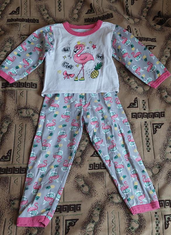 Піжама дитяча, комплект кофтинка і штани. Матеріал фланель. На кофтині є пляма, тому і ціна знижена. Кофтина: довжина по спинці 41см, напівобхват по грудях 36 см, довжина рукава 37 см. Штани: довжина 62 см.
