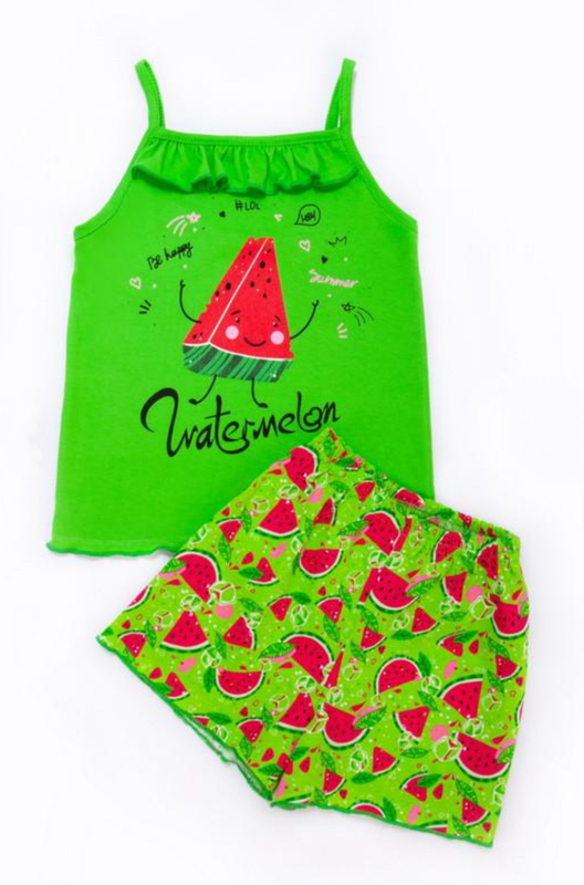 Літня піжама для дівчаток із натурального куліру. Модель складається з майки-топу на тонких бретелях з рюшею по верхньому краю та яскравим принтом, виконаним методом шовкотрафаретного друку, а також коротких шортиків на резинці із принтованого полотна. Кулір легкий, помірно тонкий, натуральний за складом – ідеальний матеріал для спекотного літа. При виборі розміру слід враховувати, що натуральні бавовняні полотна дають усадку після прання. Полотно: кулір Склад: 100% бавовна. Рекомендації з догляду: прати при температурі не більше 30°C. Допускається прання в режимі "ручне" або "делікатне", принт прасувати тільки по виворотній стороні.