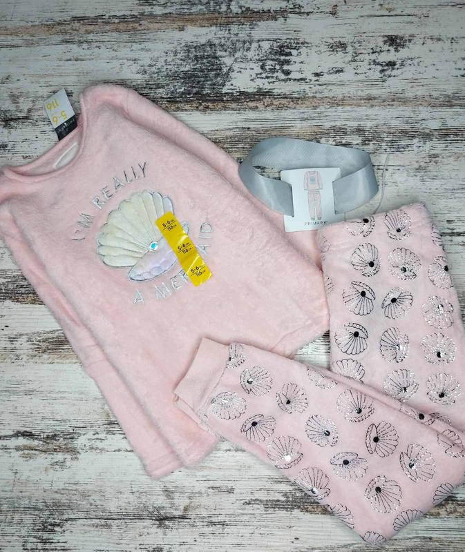 Primark Піжамка плюш, мякенька, тепла Вік 5-6 років Зріст 116 см Кофта: Довжина 42 см В груді 34 см Рукав 38 см Штани: Довжина 68 см Шаг 46 см Пояс 25 см Заміри на 122 при потребі надам.