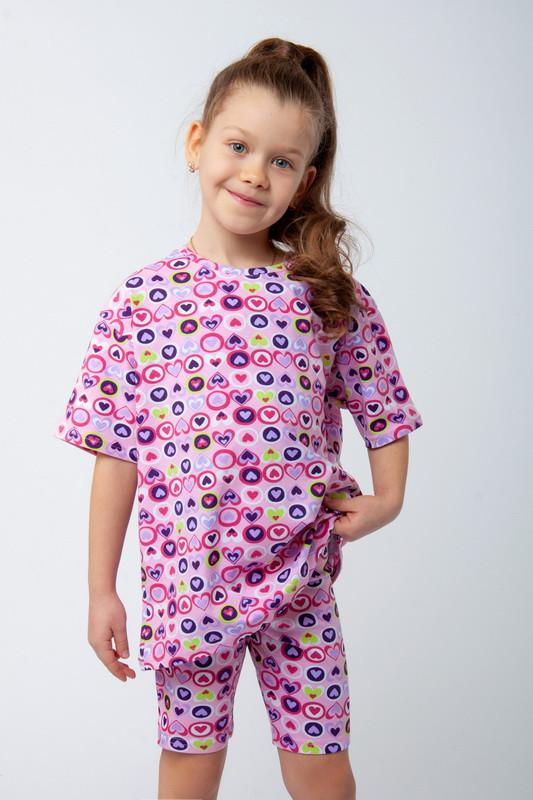 Легка зручна піжама для дівчаток з принтованого стрейч-куліру. Модель вільного крою, складається з футболки з короткими рукавами, зі спущенною лінією плеча, округлою горловиною, а також велосипедок на еластичній тасьмі. Завдяки натуральному складу полотна (95% бавовна, 5% еластан) ця піжама стане улюбленою річчю в домашньому гардеробі дівчаток, а асортимент модних принтів задовольнить будь-яку модницю. Полотно: стрейч-кулір. Склад: 95% бавовна, 5% еластан Рекомендації з догляду: прати при температурі не більше 30°C.