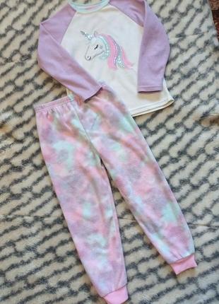 Тепла піжама для дівчинки primark Розмір - 4/5 років/ 104/110 см Заміри кофти : напівобхват грудей 34 см, довжина рукава від горловини 44 см, довжина 42 см Заміри штанів: пояс 24-34 см, напівобхват бедер 34 см, висота посадки спереду 23 см, висота посадки ззаду 24 см, кроковий шов 44 см, довжина 64 см, ширина штанини внизу 8-12 см. Тканина - мікрофліс Склад: 100% поліестер В дуже хорошому стані.