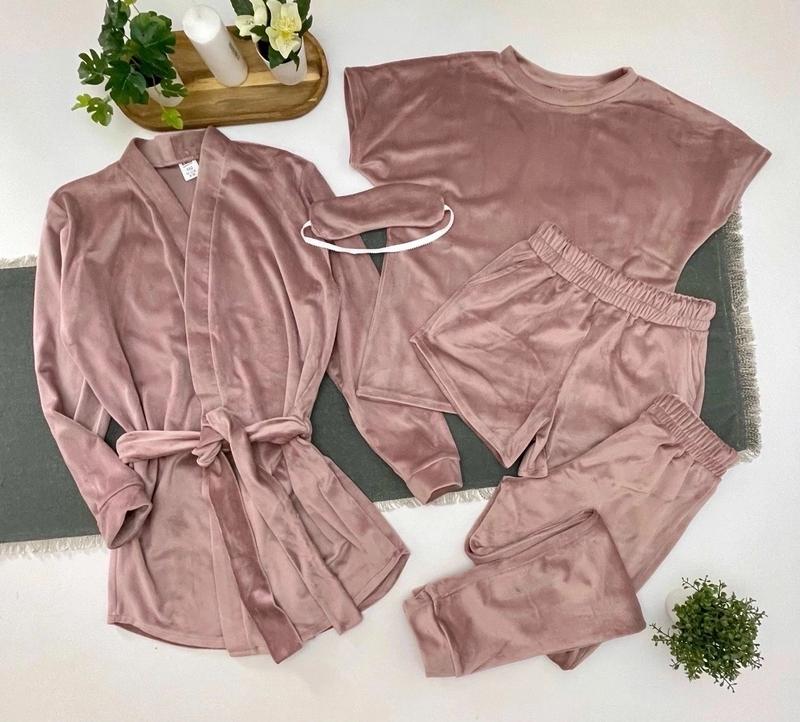 Арт Ір Комплект 5в1 Тканина - королівський велюр В комплект входять: -халат з поясом -футболка-топ, -шорти з кишенями -штани -маска на очі ЯКІСТЬ СУПЕР! РЕКОМЕНДУЮ!!! зріст/довж.халата/пог/рукав від горловини/довж.штанів/крок/пот/поб/довж.футболки/пог/довж.шорт/пот похибка+-3см 146/71/43/58/84/63/28/41/49/42/24/28-3шт 152/73/44/60/88/64/28/43/50/43/25/28-3шт 158/74/46/62/91/67/29/45/51/45/25/30-3шт 164/75/48/64/94/70/31/47/52/47/26/32-3шт