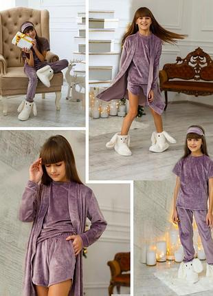 Красивый стильный комплект для сна для девочки подростка. Комплект выполнен из королевского велюра, он очень нежный и приятный на ощупь. Шикарный комплект к которому входить 5 речей: халат, шорти, штани, футболка, пов'язка на голову.