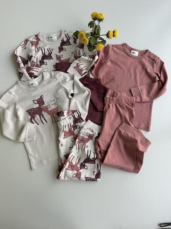 Тоненькі котонові піжами для дівчаток Кофтина на плечі має кнопки для зручного вдягання, у штанятах еластична резинка у поясі Розмір 🌾18-24 міс 🏷️250 грн за 1 Заміри 📏18-24 міс: рукав від плеча 34, довжина 40; штани пояс 25, довжина 56, крок 35