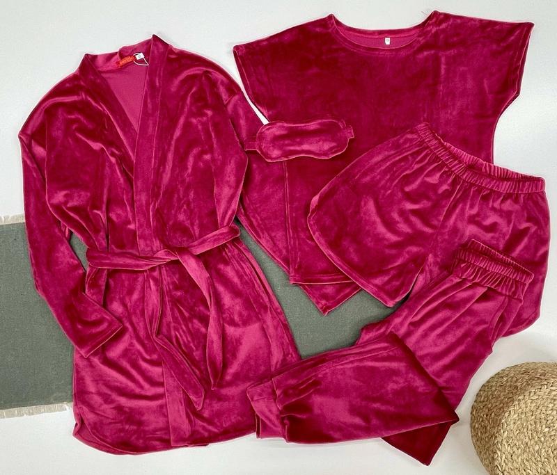 арт 4115 СУПЕР КОМПЛЕКТ! Велюрова піжама з 5 предметів -халат з поясом та кишенями -футболка -шорти -штани з кишенями -маска на очі колір БУРЯЧОК ВІДМІННА ЯКІСТЬ! зріст/довж.халата/пог/рукав від горловини/довж.ф./пог/довж.шорт/пот/довж.штанів/крок/пот/поб похибка+-2см 158/84/53/66/57/45/32/31/97/75/30/53-1шт