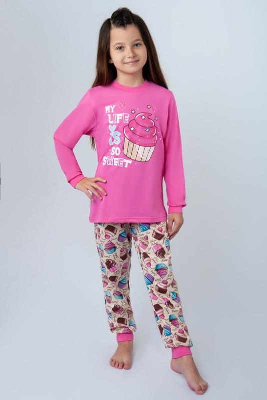 Зріст 134-164 Декор накат Полотно кулір Зручна та комфортна піжама для дівчат, виконана з полотна "Кулір". Модель складається з джемпера та штанів в комбінації однотонного та принтованого полотна, рукава та низ штанини на еластичних манжетах, кофтинка спереду прикрашена милим малюнком, який виконано методом шовкотрафаретного друку. Така річ буде відмінним варіантом для сну або просто в якості домашнього комплекту - завдяки високому вмісту бавовни не викликає подразнень та алергічних реакцій. Полотно: кулір. Склад: 100% бавовна