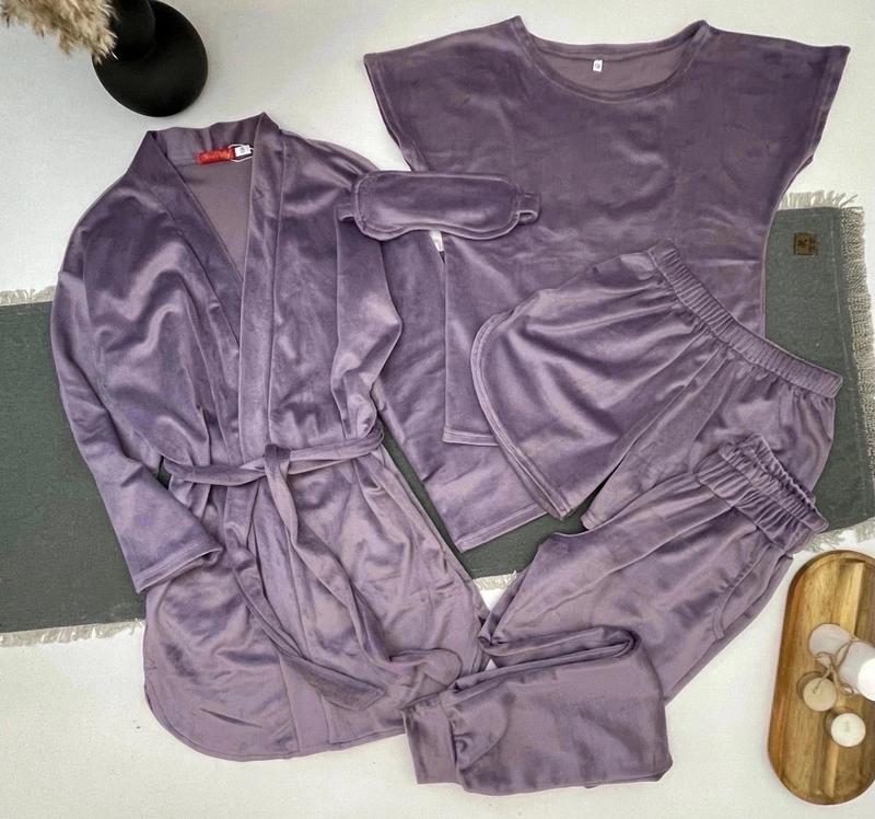 арт 1187 СУПЕР КОМПЛЕКТ! Велюровая пижама из 5 предметов -халат с поясом и карманами -футболка -шорти -брюки с карманами -маска на глаза ОТМЕННАЯ КАЧЕСТВО! рост/длин.халата/пог/рукав от горловины/длин.ф./пог/длин.шорт/пот/дл.штанов/крок/пот/поб похибка+-2см 134/72/48/56/51/41/29/27/86/66/26/48-3шт 140/75/49/58/52/41/29/28/88/67/27/49-3шт 146/78/50/61/53/42/31/30/92/70/29/50-3шт 152/80/51/63/56/42/32/30/95/72/29/51-2шт 158/84/53/66/57/45/32/31/97/75/30/53-6шт