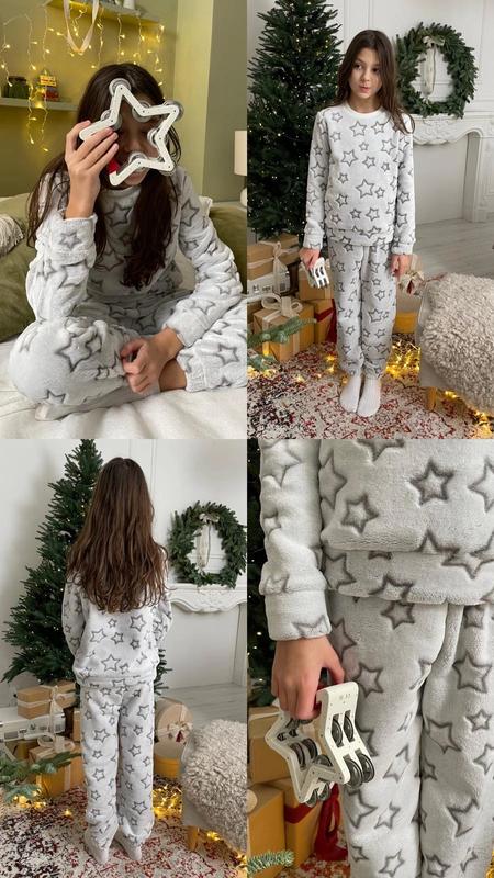 Комплект для дому та сну кофтинка внизу на манжеті, рукавчики на манжеті, горловина з трикотажу в рубчик, щоб легко пролазила голова Штанці на резинці. Тканина: двостороння махра велсофт (Туреччина) Колір: зірочка капучіно Заміри: 128 кофта довжина - 49см, напівобхват грудей - 39см, рукав від плеча - 42см. штани довжина - 75см, крок - 53см, пояс - 25см, напівобхват бедер - 42см.