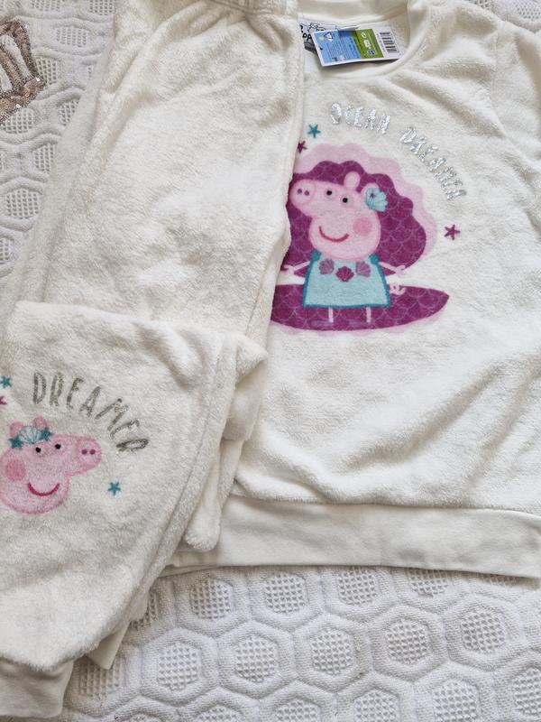 Дуже м'якенька піжама для дівчики з улюбленою Пеппою Білого кольору, малюнок є на кофтинці та внизу на штанях! На манжети. Розмір по бірочкі 6-8 років 122/128 см Заміри: Довжина рукава: 47см Довжина кофтинки: 51см Довжина штанів: 75 см