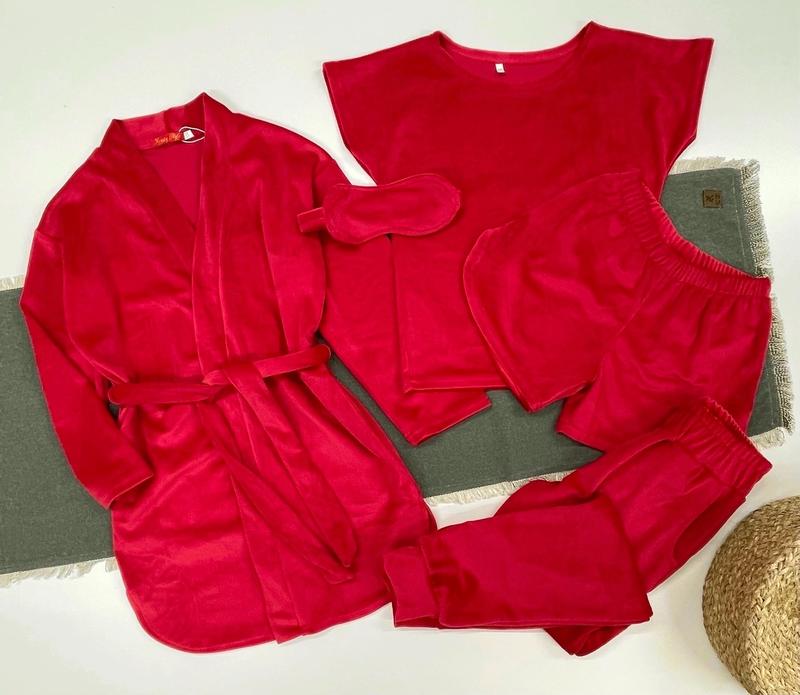 Велюрова піжама з 5 предметів СУПЕР КОМПЛЕКТ! -халат з поясом та кишенями -футболка -шорти -штани з кишенями -маска на очі ВІДМІННА ЯКІСТЬ! зріст/довж.халата/пог/рукав від горловини/довж.ф./пог/довж.шорт/пот/довж.штанів/крок/пот/поб похибка+-2см 134/72/48/56/51/41/29/27/86/66/26/48 140/75/49/58/52/41/29/28/88/67/27/49 146/78/50/61/53/42/31/30/92/70/29/50 152/80/51/63/56/42/32/30/95/72/29/51 158/84/53/66/57/45/32/31/97/75/30/53