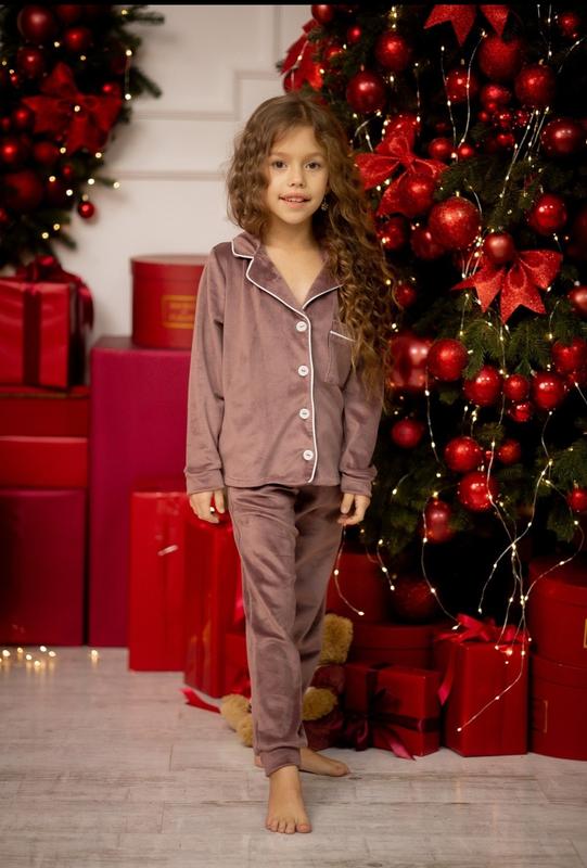 Затишна піжамка,чудовий комплект для дому тканина королівський велюр, дуже добре тягнеться , приємна до тіла та дуже м'яка на кофтинці по всій довжині є гудзики та одна накладна кишеня,в поясі на резинці,гарно тягнеться,є кишені заміри:сорочка довжина/рукав від плеча/пог/штани довжина/крок/поб 146-55/52/46/86/65/43 Ир.д