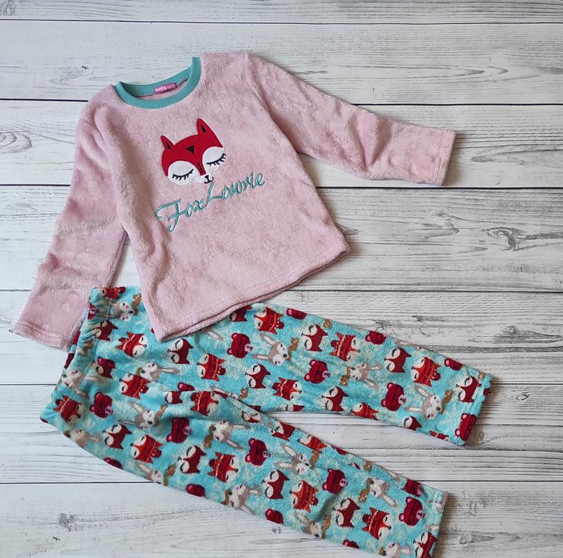 Тепла піжами "Лиса" Вказан розмір 12 р, маломірить. Носили при зрості близько 130-140 см. Орієнтуйтесь на виміри: Кофта рукав + плече 47+9 см, по 40 см, довжина 50 см Штани пот 27 см (м'яка резинка, тягнеться), пос 43 см, довжина 75 см, кроковий 55 см.