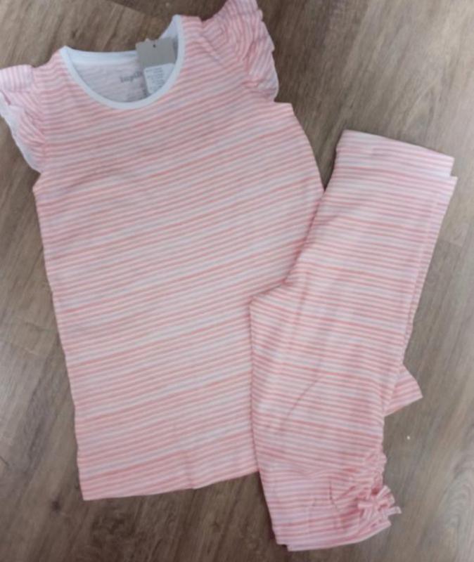 Літня дитяча трикотажна піжама. Комплект складається з туніки і капрів.Костюм виготовлений з натурального матеріалу, який надійно зберігає оптимальну температуру тіла, дозволяє шкірі дихати, дуже приємний на дотик. Піжама вільного крою не обмежує руху, тому в ній комфортно не лише спати, а й ходити по дому. В наявності розмір 110-116 на 4-6 років Довжина футболки 50см.дап-31см. довжина капрів-43см, талія по резинці 26см.