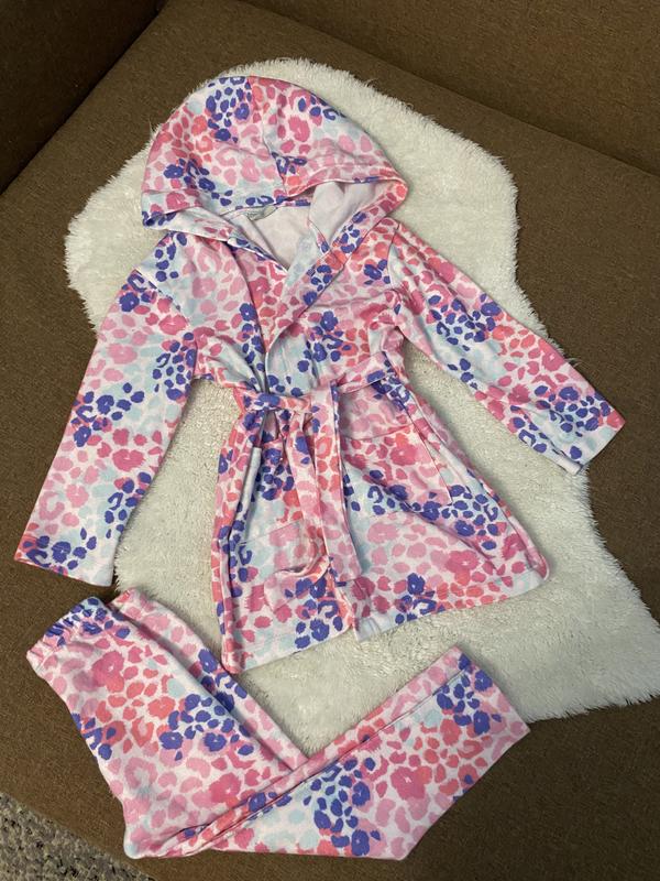Вік вказано 5 рочків Без дефектів у відмінному стані Довжина халатика 56 Груди 36 Рукав від горловини 45 Довжина лосін 55 Шаговий 39 Талія 22/34 Стегна 30 Тепла приємна на дотик тканина