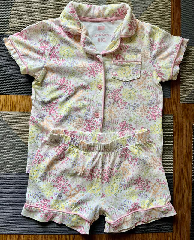 Піжамка для дівчинка F&F Вік вказано 4-5 років 110 см. Гарна та приємна тканина 100% котон. Заміри: Кофтинка : Довжина 41 см Ширина під пахвами 35 см Довжина рукава від плечового шва 11 см Шортики: Довжина 23 см Талія 25 см, тягнеться до 38 см Бедра 36 см