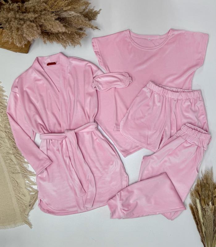 арт 6892 Велюрова піжама з 5 предметів СУПЕР КОМПЛЕКТ! -халат з поясом та кишенями -футболка -шорти -штани з кишенями -маска на очі ВІДМІННА ЯКІСТЬ! похибка+-2см 🔹146р- довж.халата 78, пог 50, рукав від горловини 61, довжина футболки 53, пог 42, довжина шорт 31, пот 30, довжина штанів 92, крок 70, пот 29, поб 50 🔹152р- довж.халата 80, пог 51, рукав від горловини 63, довжина футболки 56, пог 42, довжина шорт 32, пот 30, довжина штанів 95, крок 72, пот 29, поб 51 🔹158р- довж.халата 84, пог 53, рукав від горловини 66, довжина футболки 57, пог 45, довжина шорт 32, пот 31, довжина штанів 97, крок 75, пот 30, поб 53 👉За Безпечну оплату уточнюйте. ⚠️Через кнопку КУПИТИ тількі по повній оплаті, тому не тисніть її, до уточнення деталей. 🚚Нова пошта, є наложка з передоплатою 🚛 Укрпошта- +5грн пакування (укрпоштою наложки немає ❗️) По оплаті і доставці уточнюйте додатково, до купівлі! Повернення є при відмові у відділенні, робіть свій вибір обдуманно. Оглядайте товар у відділенні, претензії з дому не розглядаються! ір