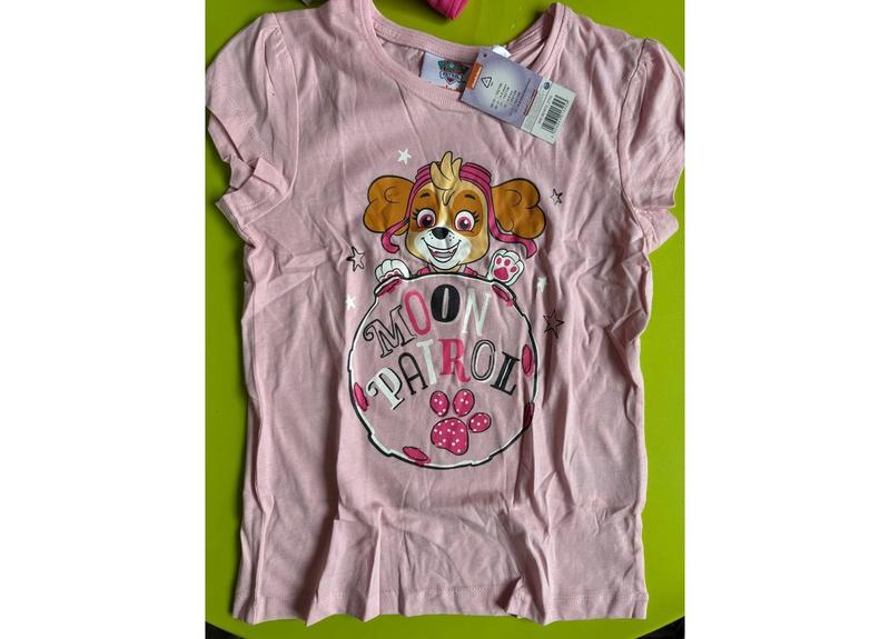 Це дитячий комплект для сну, присвячений відомому мультсеріалу «Щенячий патруль» (Paw Patrol). Комплект включає рожеву футболку з принтом героїні Скай, яка тримає логотип із написом "Paw Patrol". Футболка виготовлена з бавовни, що робить її м'якою та комфортною.