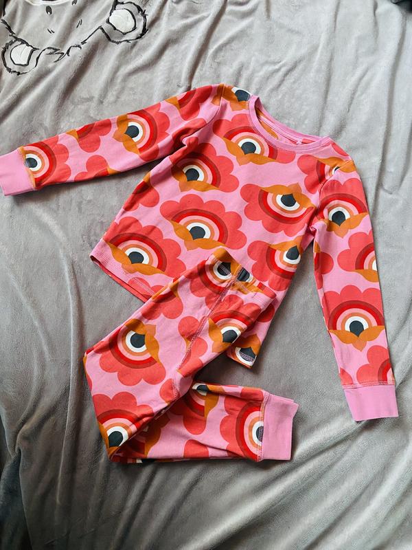 Гарненька яскрава котонова піжамка Next. Стан ідеальний. Розмір 116 (5-6 років), але найкраще орієнтуватись на заміри. Кофтинка: довжина по спинці 39 см ПОГ 33 см довжина рукава 40 см Штанці: ширина резинки в поясі 25 см довжина по зовнішньому шву 61 см, по внутрішньому 39 см посадка спереді 21 см, ззаді 23 см Дод. фото та заміри на вимогу.