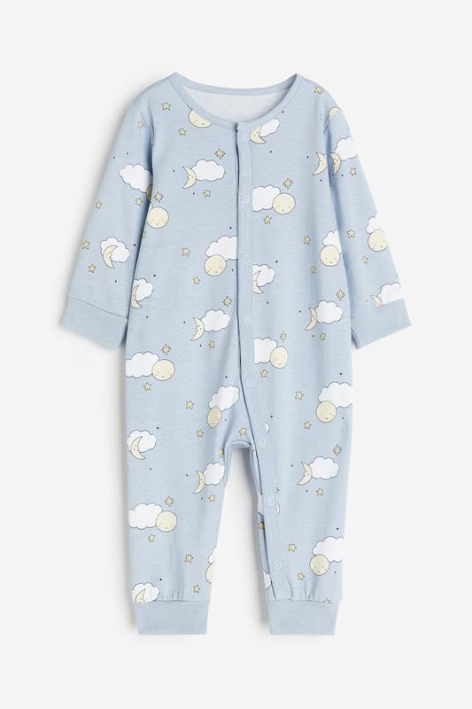 H&M, виготовлений із надм'якого бавовняного трикотажу, з позначкою "100% Organic Cotton Має довгі рукави з манжетами, відкриті стопи та застібки-кнопки по всій довжині спереду та вздовж однієї штанини, що полегшує процес перевдягання