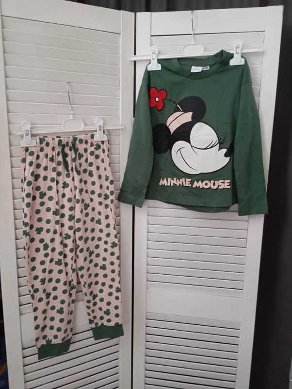 Зелена кофта з довгими рукавами. На передній частині великий принт Мінні Маус з червоним бантом та напис "MINNIE MOUSE". штани з еластичним поясом. Вони прикрашені візерунком із зелених горошків у формі голови Мінні Маус. Манжети штанів також зеленого кольору.