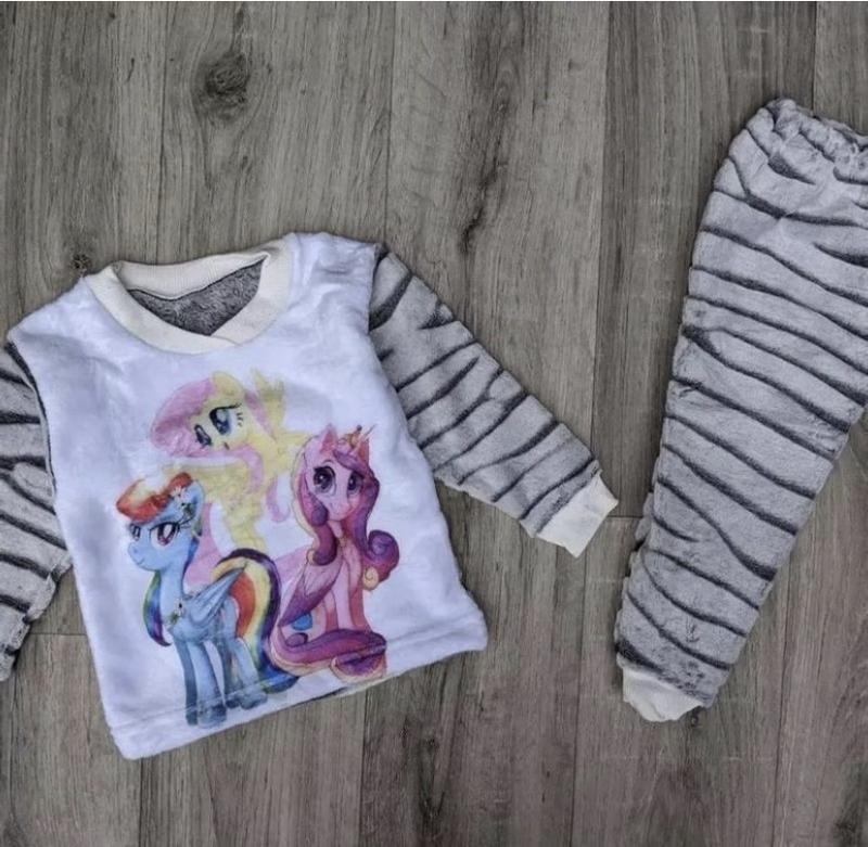 Піжама махрова для дівчинки. Сіра з поні розмір 26 (86-92), 30 (98-104) Рожева з зайками розмір 26 (86-92), 32 (104-110) Заміри: Розмір 26 (86-92): кофта ширина під рукавами 28, довжина рукава 28, брюки довжина 47см. Розмір 28 ( 92-98): кофта ширина під рукавами 30, довжина рукава 30, брюки довжина 54 см. Розмір 30 (98-104): кофта ширина під рукавами 31, довжина рукава 34, брюки довжина 57см. Розмір 32 (104-110): кофта ширина під рукавами 33, довжина рукава 37, брюки довжина 64см.