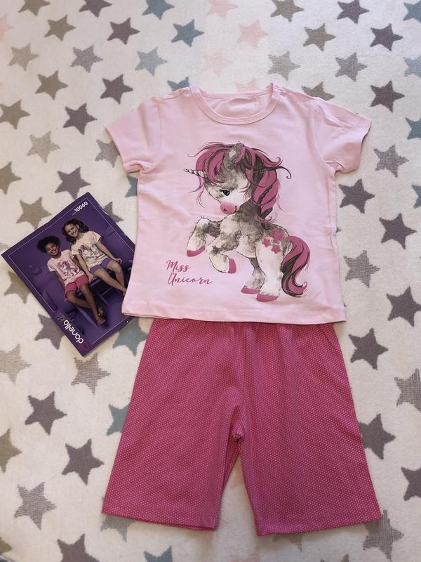 Отливная пижама на лето ,которая может служить костюмом для прогулок ,красивый розовый цвет ,любимый детьми единорог.Шорты и футболка,не садится при стирке ,рисунок не стирается.