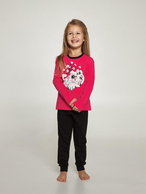 Комплект домашній для дівчинки ТМ Ellen, бавовняний з начосом : кофта малинового кольору з довгими рукавами, круглий виріз горла декорований чорною облямівкою. По центру принт білого цуценя з малиновим бантом в горохи. Штани з м'якою гумкою на поясі чорного кольору, вниз на манжетах. Склад: 95% бавовна, 5% еластан