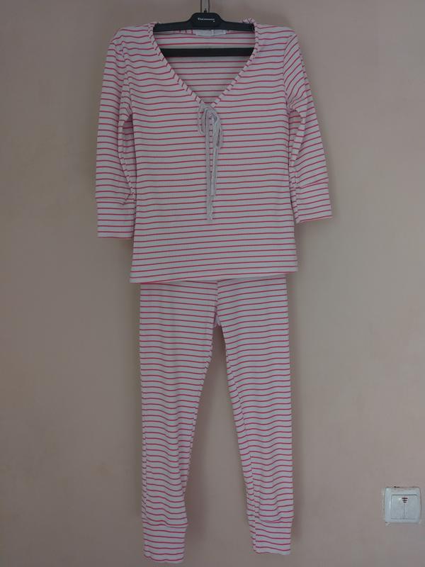 Дуже зручна піжама в рубчик, рукав 3/4 Кофточка: ПОГ 37 см. Ширина низ 50 см. Довжина 50 см Довжина рукава від горловини 44 див. Штани: ПІТ 26 див. ПОБІДИ 43 см. Довжина зовнішнього шва 73 див. внутрішнього шва 52 див. Посадка 23/27 Тканина тягнеться