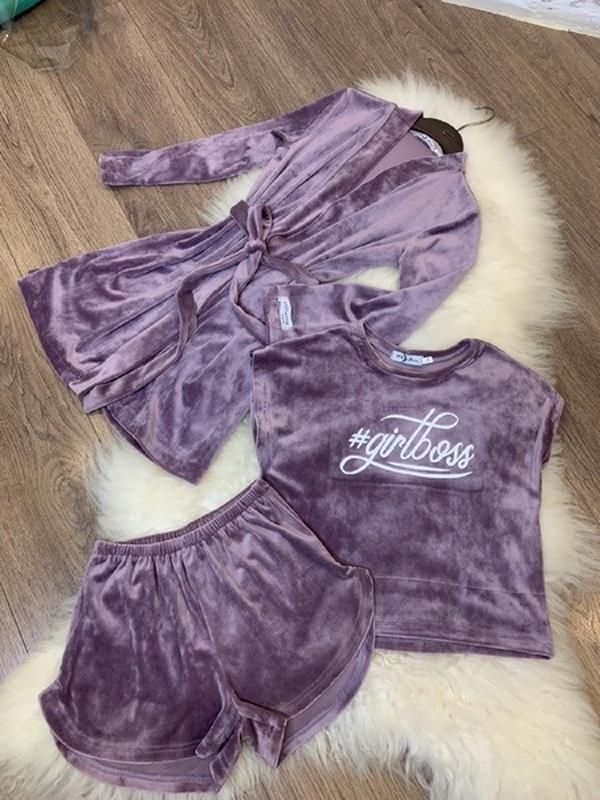 Нереально крутая пижамка+халат для девочки. Украшено переливающеюся надписью,прорезиненный накат , Ткань велюр, очень приятная к телу ,хорошо тянется . цена 610грн длина/рукав/пог/длина/пог/длина/пояс 134-68/46/43/39/28/24 140-71/48/44/41/29/26 146-75/52/46/42/30/26 152-77/52/47/43/31/27 158-79/58/50/44/32/28 164-81/60/53/47/33/29
